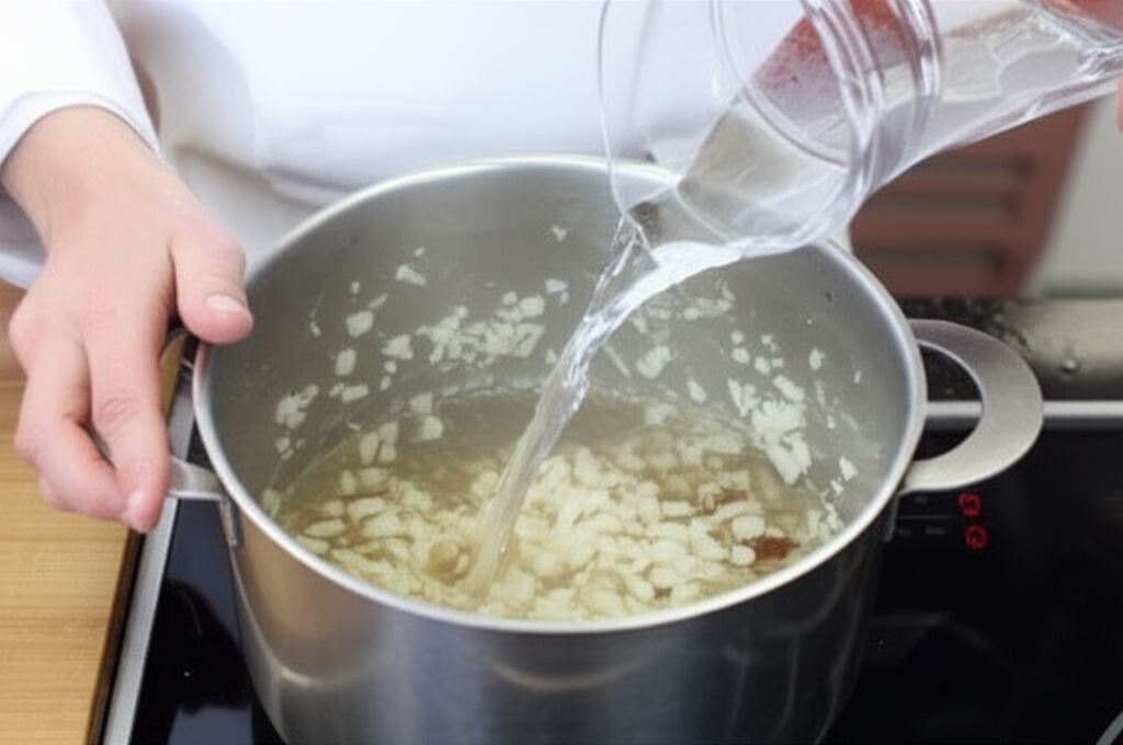 Na tłuszczu pozostałym po boczku zrumień posiekaną cebulę i czosnek. Kiedy nabiorą złotego koloru, dodaj litr wody.