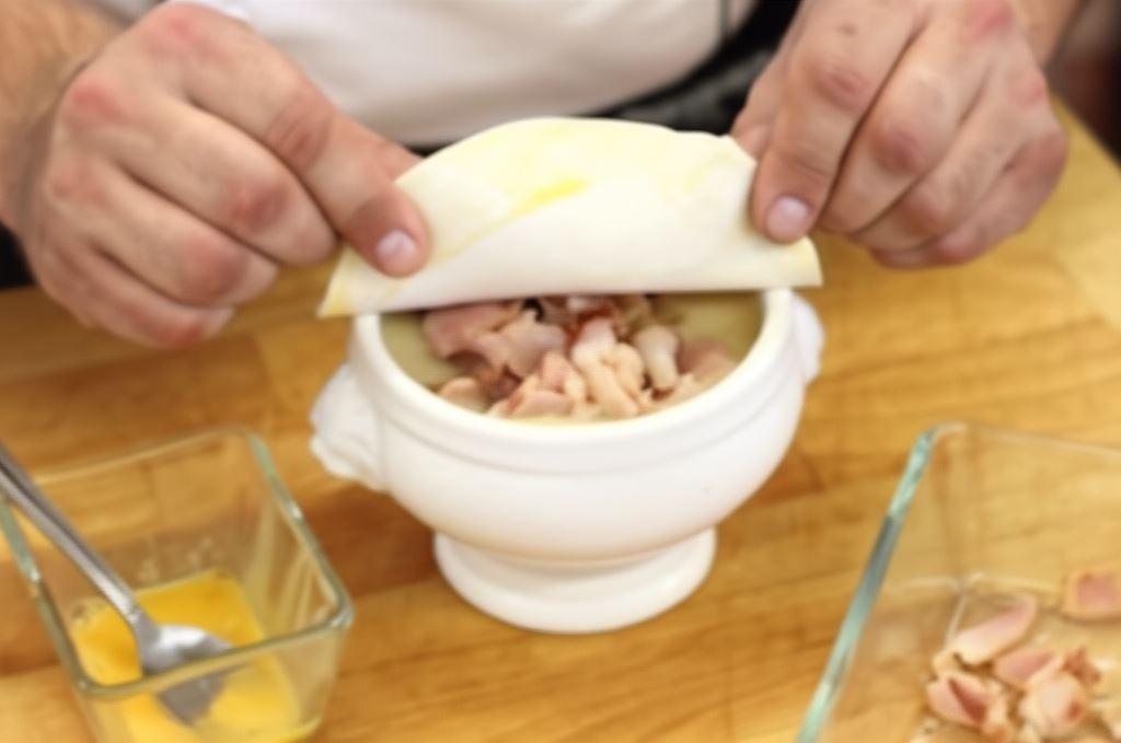 Krawędzie ciasta posmaruj żółtkiem i dokładnie przykryj naczynie zawierające zupę.