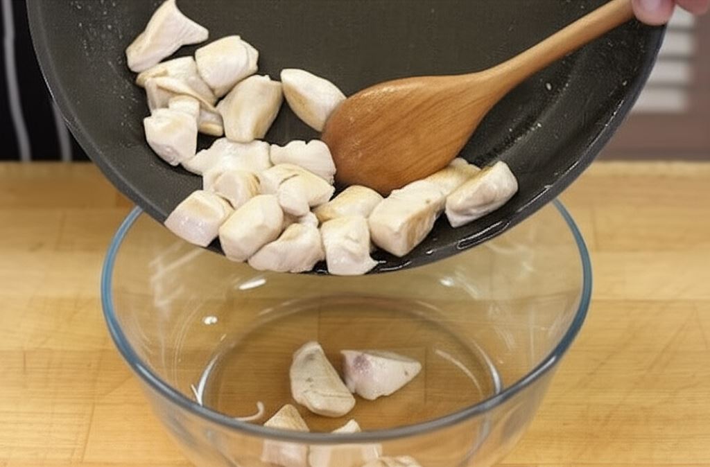 Mięso potnij w kostkę i zrumień na mocno nagrzanej patelni. Przenieś do większego naczynia.