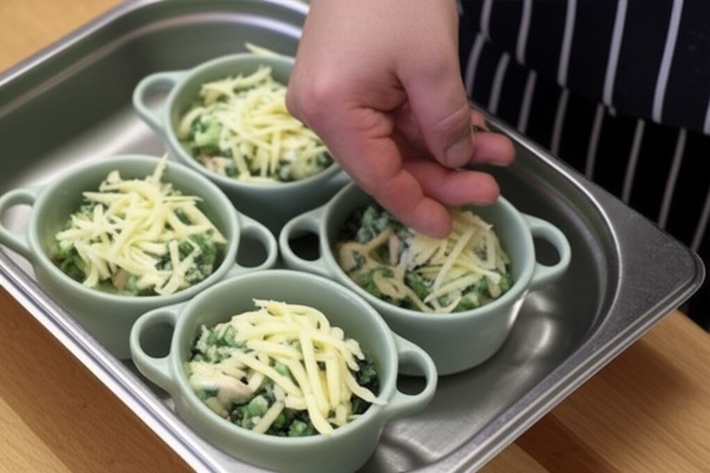 Przygotowaną mieszaninę przenieś do kilku mniejszych naczyń do zapiekania i obsyp serem. Zapiekaj w temperaturze 180 °C, dopóki ser się nie stopi (około 10 minut). Na zakończenie posyp całość papryką. W taki sposób możesz też przyrządzić zapiekaną rybę z warzywami.