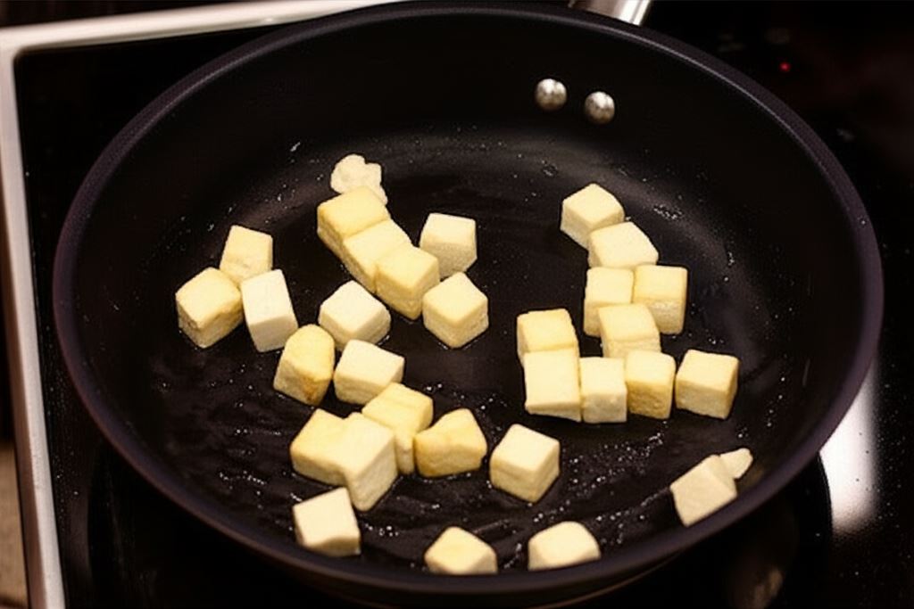 Tofu pokrój w drobną kostkę i przysmaż na 1 łyżce oleju. Po usmażeniu odstaw na bok. Cebulę drobno posiekaj i poduś ją na patelni na następnej łyżce oleju.