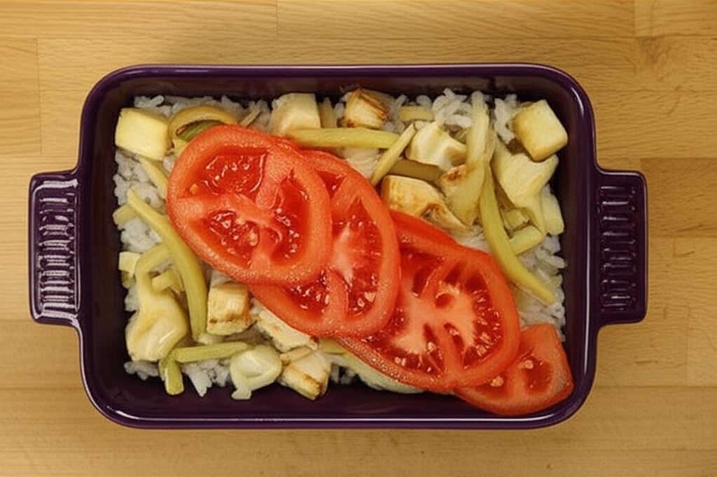 Odkryj nowe oblicze zapiekanki! Aromatyczny ryż połączony z delikatnym tofu, chrupiącą fasolką szparagową i soczystymi pomidorami tworzy kompozycję, która zachwyci nawet najbardziej wymagających smakoszy. Ta warzywna uczta to nie tylko eksplozja smaków, ale również źródło cennych składników odżywczych.