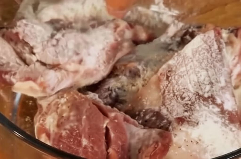 Podzielone na kawałki żeberka posyp solą i pieprzem oraz mąką, następnie wymieszaj.