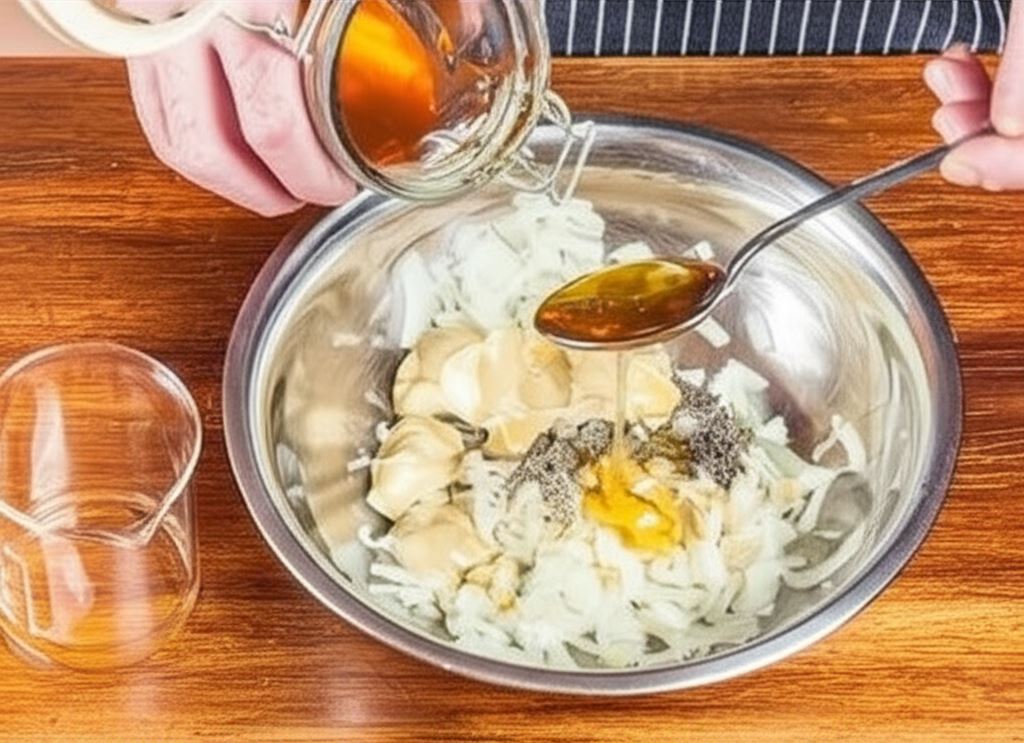 Cebulę posiekaj drobno, dodaj tymianek, musztardę, miód oraz białe wino. Przypraw do smaku.