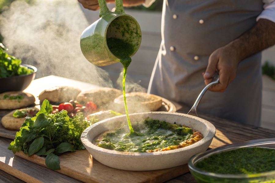 Tradycyjnie sos zhoug podawany jest jako dodatek do zup i gulaszów, gdzie jego intensywny smak doskonale przełamuje cięższe dania.