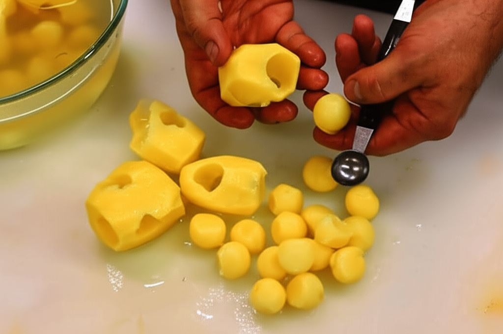 Obierz ziemniaki i za pomocą specjalnej łyżeczki wydrąż w nich maksymalnie dużo kulek.