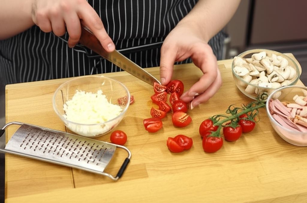 Szynkę potnij na cienkie paski, pieczarki podziel na ósemki, pomidorki przekrój na ćwiartki, a ser zetrzyj używając tarki o dużych oczkach.