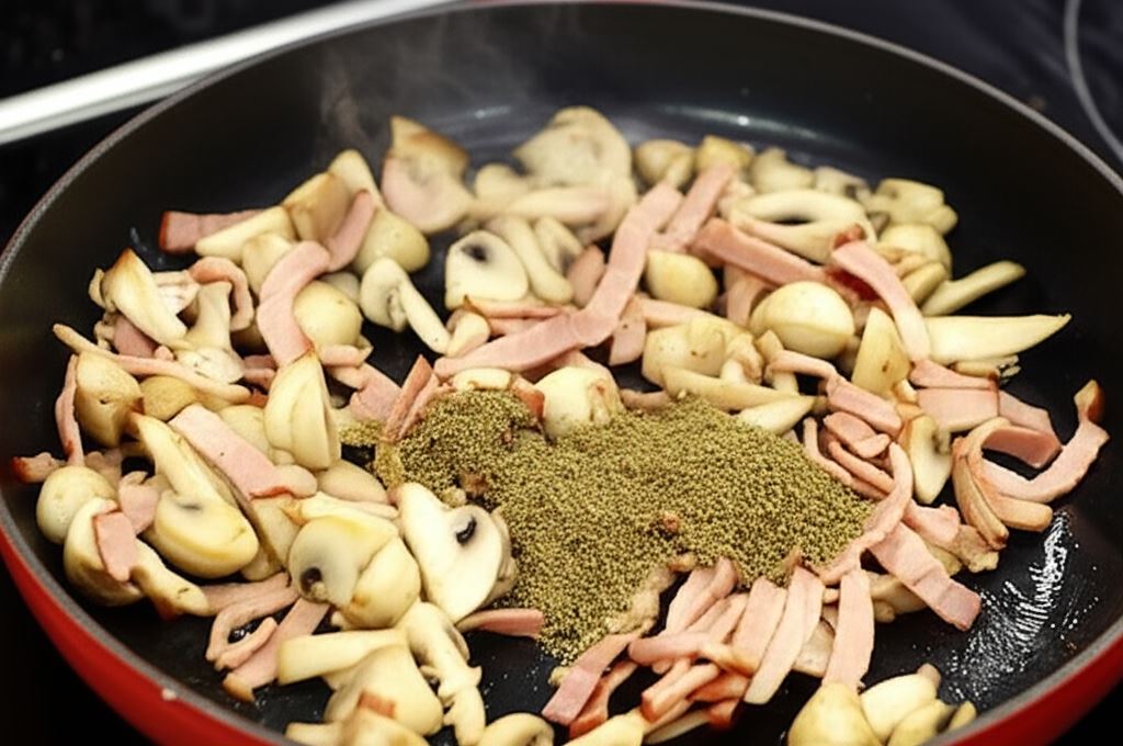 Na patelni podgrzej oliwę, zrumień szalotkę, szynkę i pieczarki. Wsyp mieszankę Knorr i podsmaż moment razem. Ostudź.