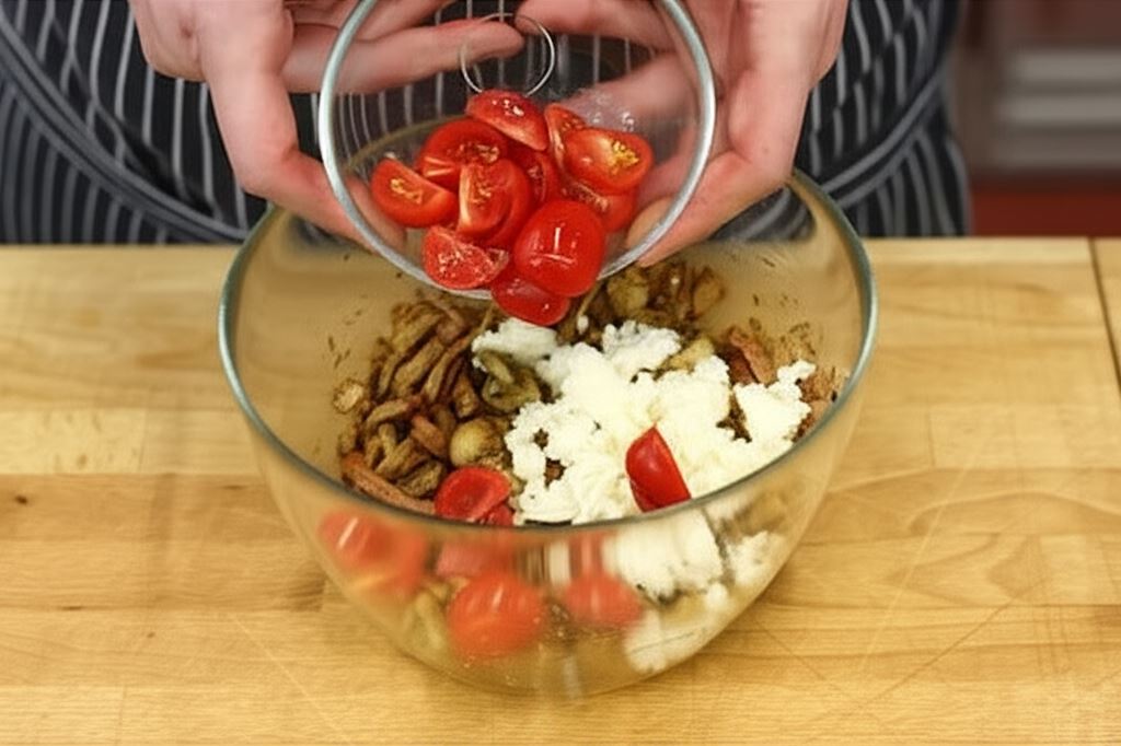 Po ostygnięciu dodaj do farszu pokrojone pomidory i połowę startego sera. Wszystko wymieszaj i dopraw według smaku.