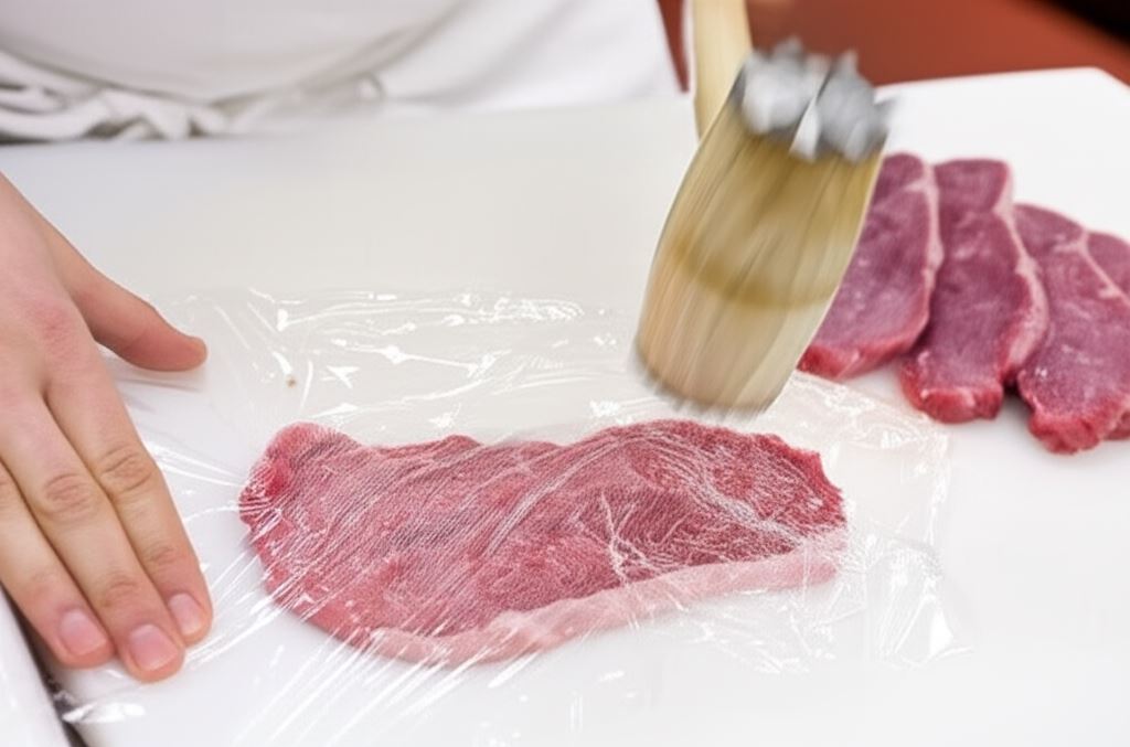 Mięso potnij na mniejsze porcje, około 10 dekagramów każda. Potem roztłucz tłuczkiem do mięsa na szerokie, cienkie plastry.
