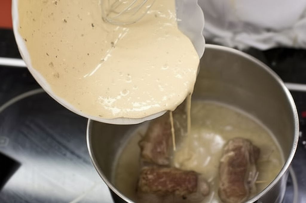 Nalej wody, aby zakryła mięso. Wsyp Kostkę do mięsa pieczeniową Knorr. Całość gotuj około 40 minut, aż zrazy staną się miękkie i sos zgęstnieje, na końcu sos połącz ze śmietaną. Serwuj z kaszą gryczaną lub kluskami. Pamiętaj, aby przed serwowaniem wyjąć wykałaczki.