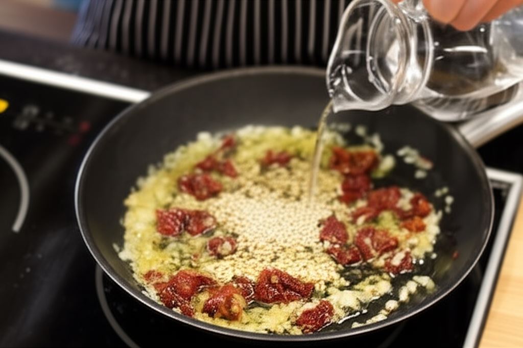 Na rozgrzanej oliwie podsmaż czosnek, cebulę oraz pomidory pokrojone w cienkie paski. Dodaj pęczak i dolej wodę (250 ml) – doprowadź do wrzenia, potem zredukuj ogień i gotuj aż cały płyn zostanie wchłonięty. Ugotowany pęczak przypraw według uznania i odstaw do ostygnięcia.