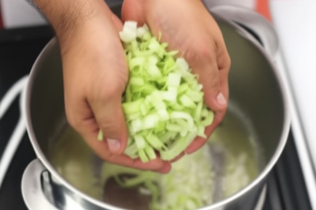 Podgrzej tłuszcz i obsmaż pory przez 5 minut.