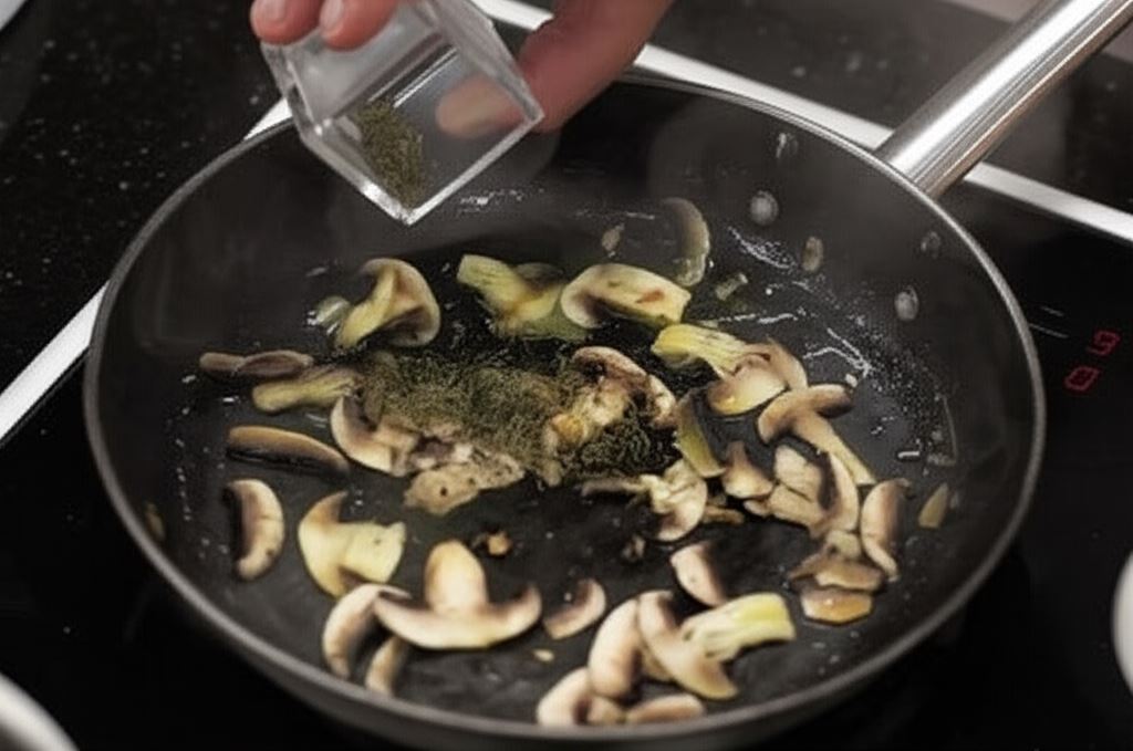 Pokrój pieczarki na plastry i zrumień je na tłuszczu. Potem dopraw niewielką ilością soli i pieprzu oraz odrobiną tymianku.