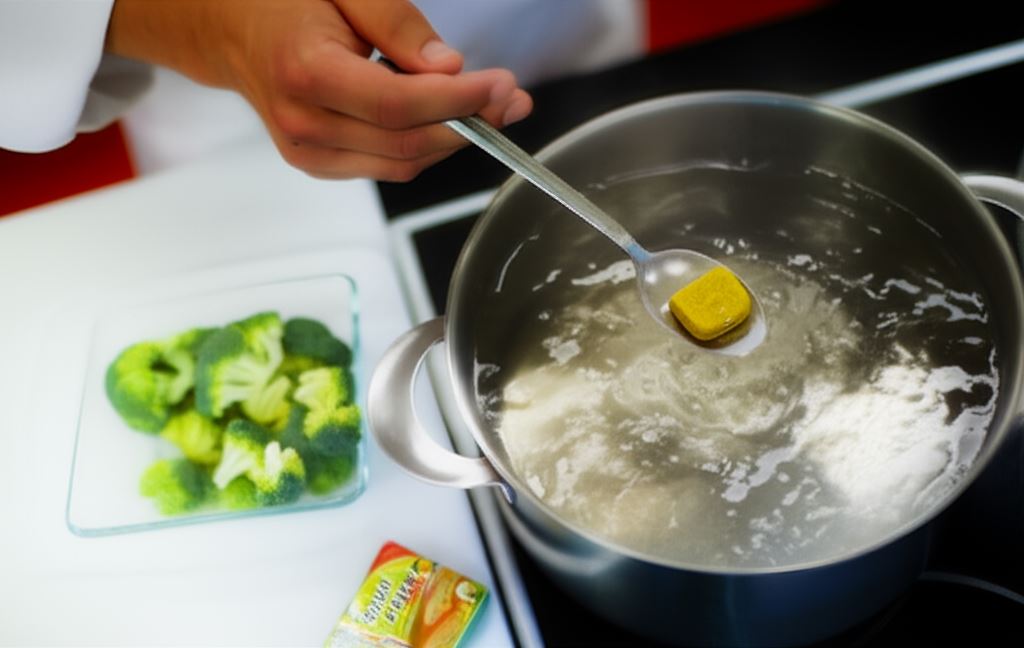 W międzyczasie przygotuj garnek z wodą, wsyp kostkę rosołową. Brokuły opłucz i gotuj około 30 minut, do miękkości, odcedź i pozostaw do ostygnięcia.