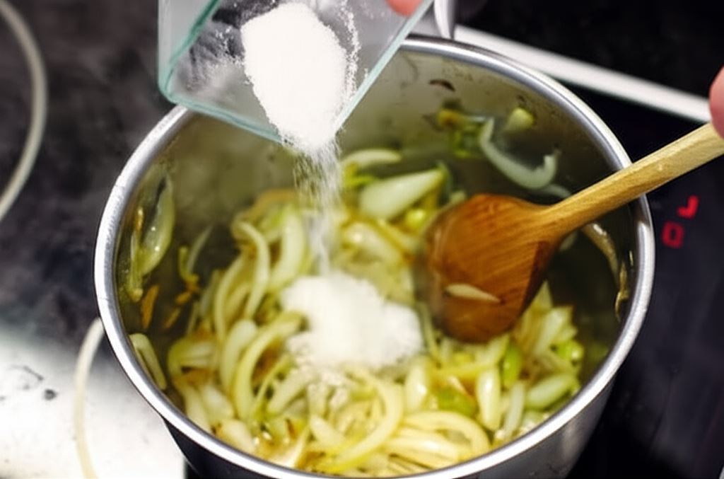 Na rozgrzanym tłuszczu w garnku zrumień cebulę, dopóki nie zacznie lekko zmieniać barwę, w końcowej fazie smażenia wsyp cukier, smaż go razem z cebulą, aż rozpocznie się karmelizacja.
