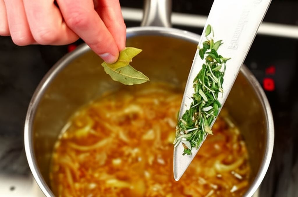 W osobnej misce, utrzymując proporcje z opakowania, wymieszaj w wodzie francuską zupę cebulową Knorr. Wlej do garnka, gotuj przez kolejne 5 minut.
