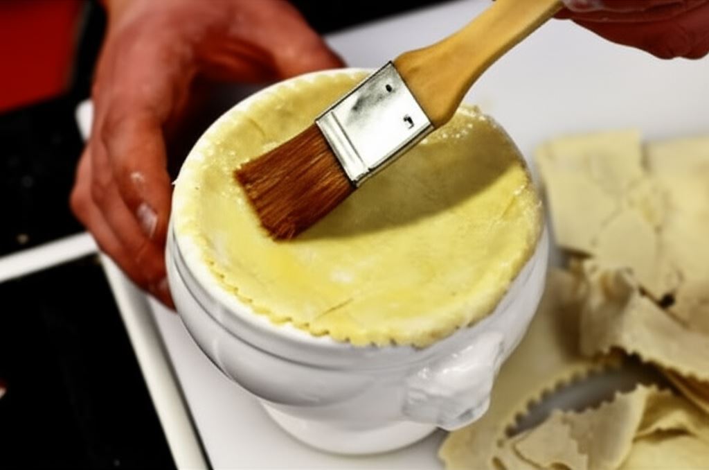 Ciasto francuskie odmroź, rozwałkuj na grubość około 3 mm, posmaruj roztrzepanym jajkiem. Całość umieść na wierzchu filiżanki z zupą. Ciasto ponownie posmaruj jajkiem na wierzchu.