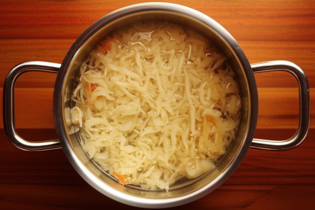 Kapustę z grochem umieść w garnku, zalej bulionem i gotuj przez około 30 minut.