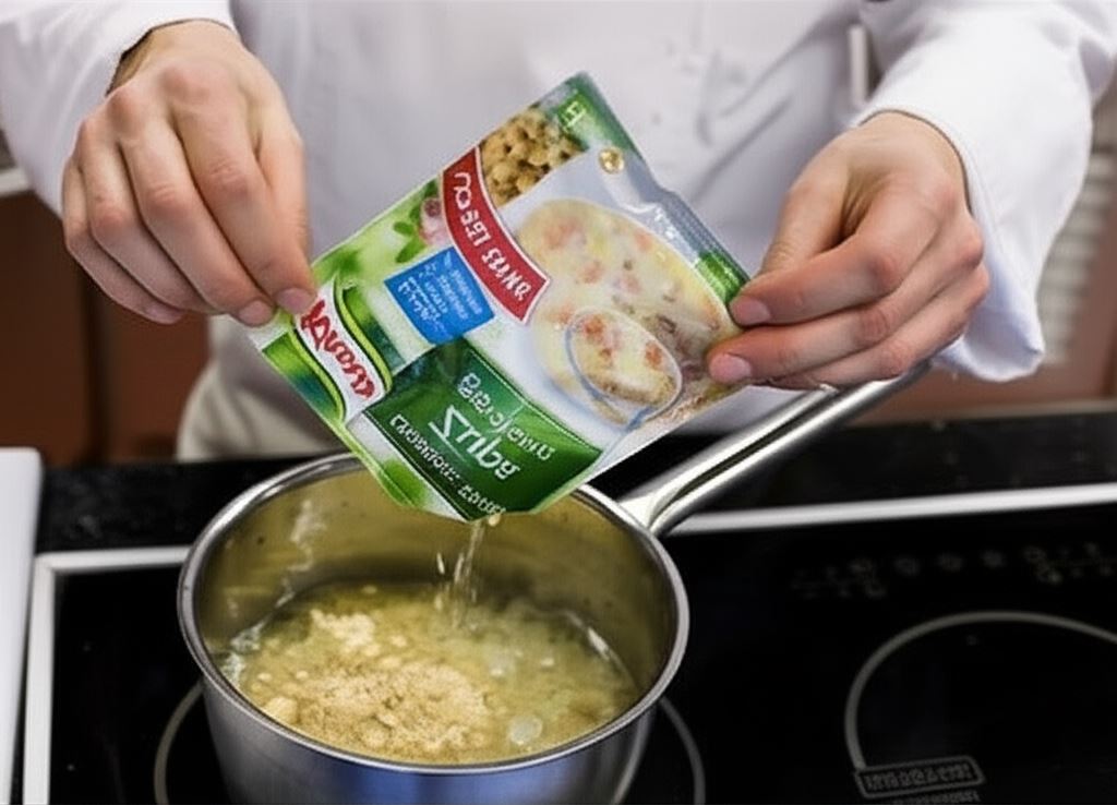 Ziemniaki pokrój w dużą kostkę i wrzuć do zupy. Zupę przypraw do smaku kostką Knorr, gotuj jeszcze parę minut aż ziemniaki staną się miękkie. Podawaj gorącą.