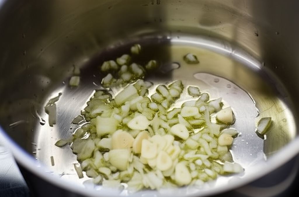 Cebule posiekaj w kostkę. Zrumień na oleju, wsyp czosnek smaż moment.