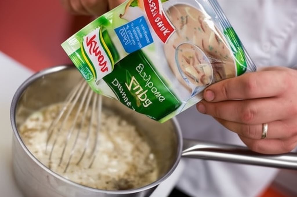 Zupę Knorr wymieszaj ze śmietaną i wywarem. Wlej do garnka, doprowadź do wrzenia – gotuj następnie na małym ogniu przez około 3 minuty.