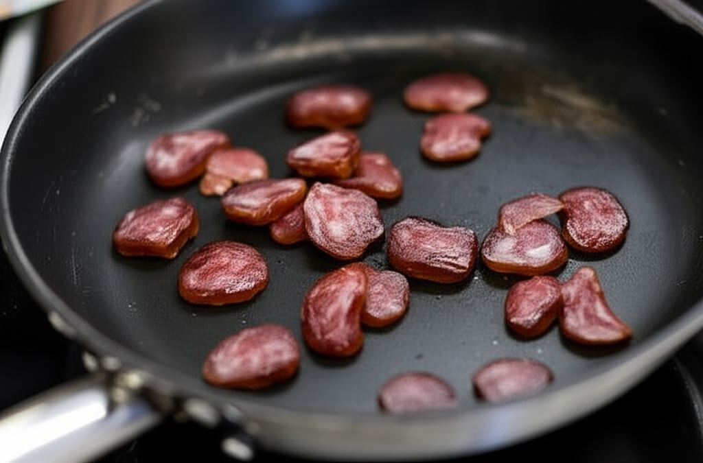 Kabanosy potnij na plastry, przysmaż na patelni. Szczypiorek posiekaj.