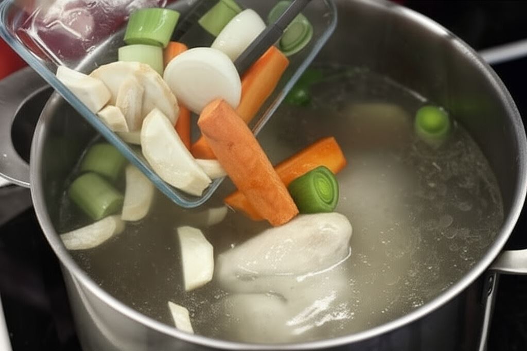 Teraz wsyp posiekaną włoszczyznę i gotuj rosół przez około 40 minut.