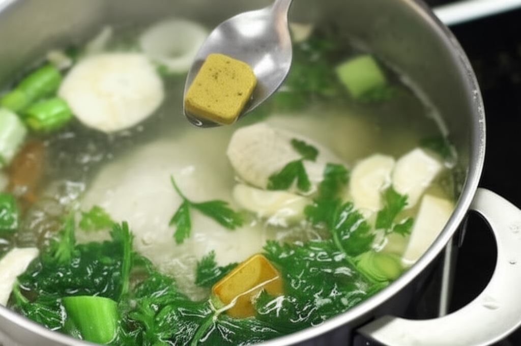 Po upływie tego czasu wsyp zieleninę, dodaj przyprawy i kostki Knorr. Następnie gotuj na wolnym ogniu przez kolejne 30 minut, by rosół zyskał smak i pozostał klarowny.
