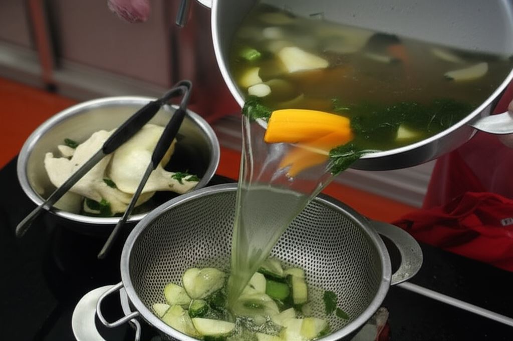 Kiedy stwierdzisz, że rosół jest ugotowany, wyciągnij z niego duże części włoszczyzny i mięso. Pozostałość przefiltruj do innego garnka.
