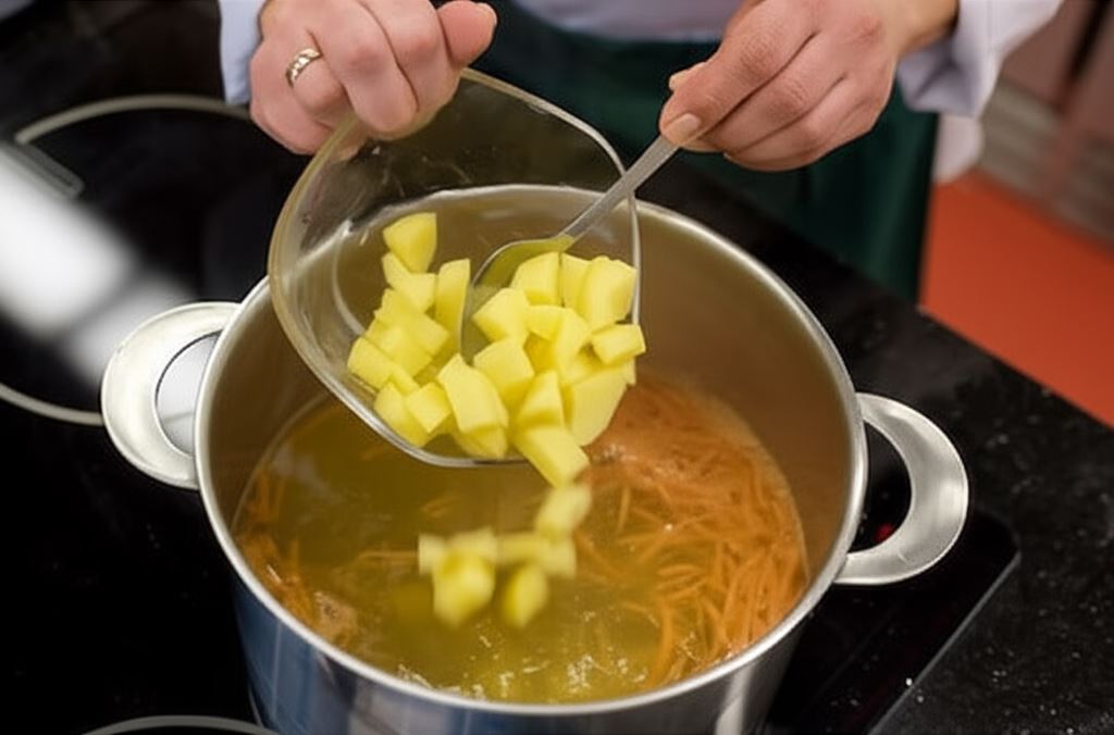 Wrzuć pocięte ziemniaki, marchewki i gotuj przez 15 minut.