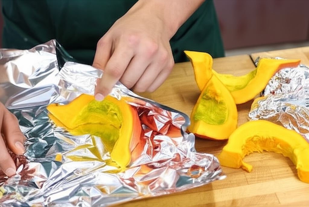 Dynię oczyść z nasion, owiń w folię aluminiową i umieść w rozgrzanym do 200 st. C piekarniku na 30 minut. Po upieczeniu zdejmij skórkę i potnij na kawałki. Jabłka pokrój w małą kostkę.
