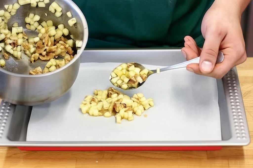 Miód podgrzej w rondelku razem z pieprzem Cayenne. Orzechy i połowę pokrojonego jabłka połącz z miodem. Blachę do pieczenia wyłóż papierem pergaminowym i umieść na niej przygotowane orzechy i jabłka – blachę włóż do rozgrzanego do 190 st. C piekarnika i piecz aż miód się skarmelizuje. Wyjmij i pozostaw do ostygnięcia.
