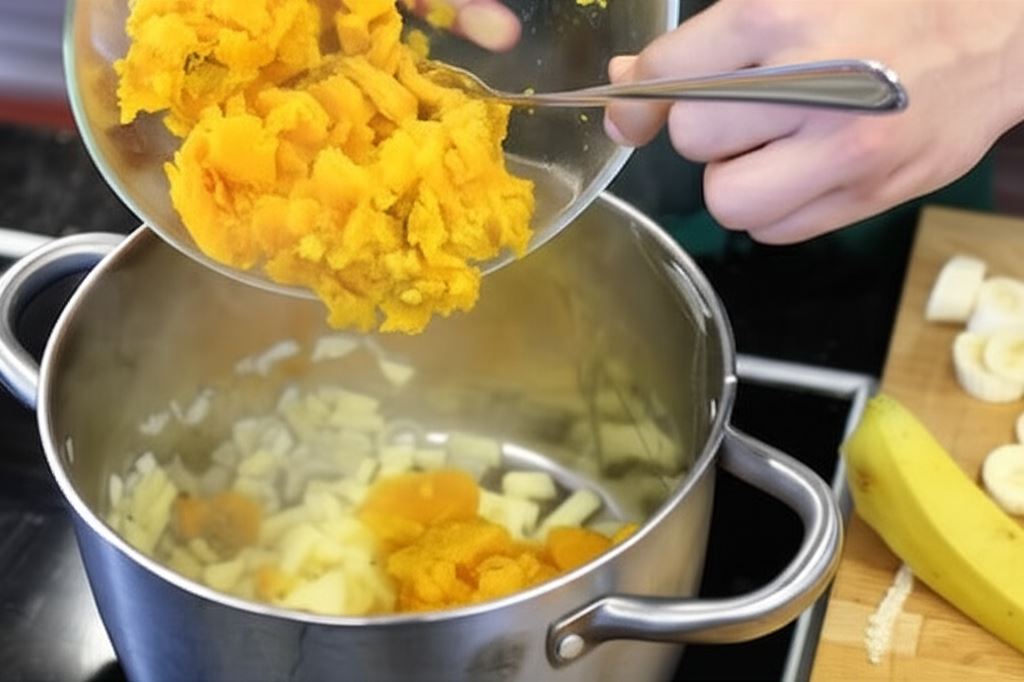 W rondlu roztop masło i zrumień cebulę, resztę jabłek, dynię oraz pokrojonego na kawałki banana. Wsyp curry oraz cynamon i duś wspólnie 3 minuty.