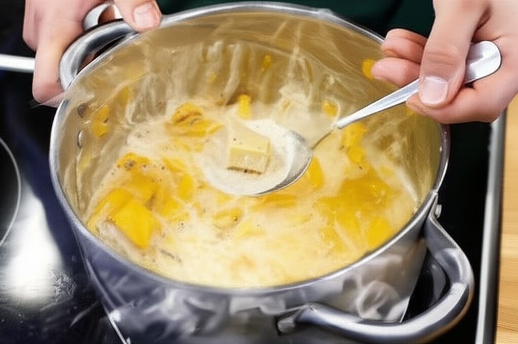 Potem dodaj mleko kokosowe i bulion, po czym doprowadź do wrzenia. Zredukuj ogień, wsyp kostkę Knorr i gotuj przez 15 minut.