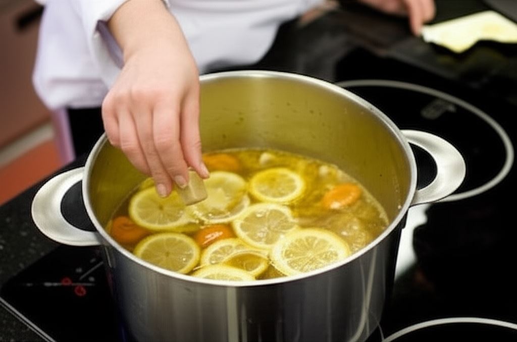 Po tym czasie wlej sok pomarańczowy i plasterki cytryny. Dodaj także 2 kostki Rosołu szlachetnego drobiowo-warzywnego Knorr. Następnie zblenduj zupę dokładnie na jednolitą konsystencję.