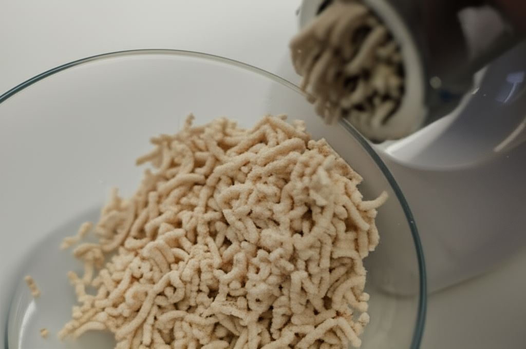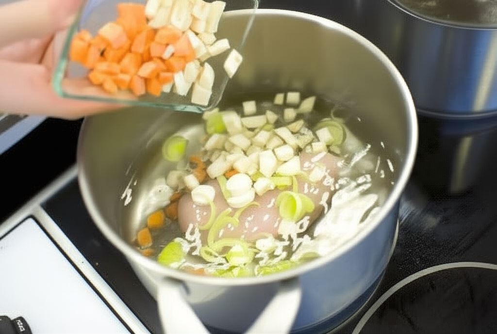 Wyjmij kurczaka, zmiel go i dodaj do przecedzonego wywaru.