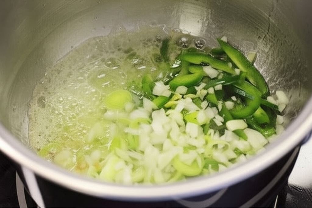 W rondlu podgrzej masło i oliwę, dodaj pokrojoną w kostkę cebulę, posiekany czosnek, paprykę pociętą w paseczki oraz por pokrojony w talarki. Podsmażaj przez parę minut.