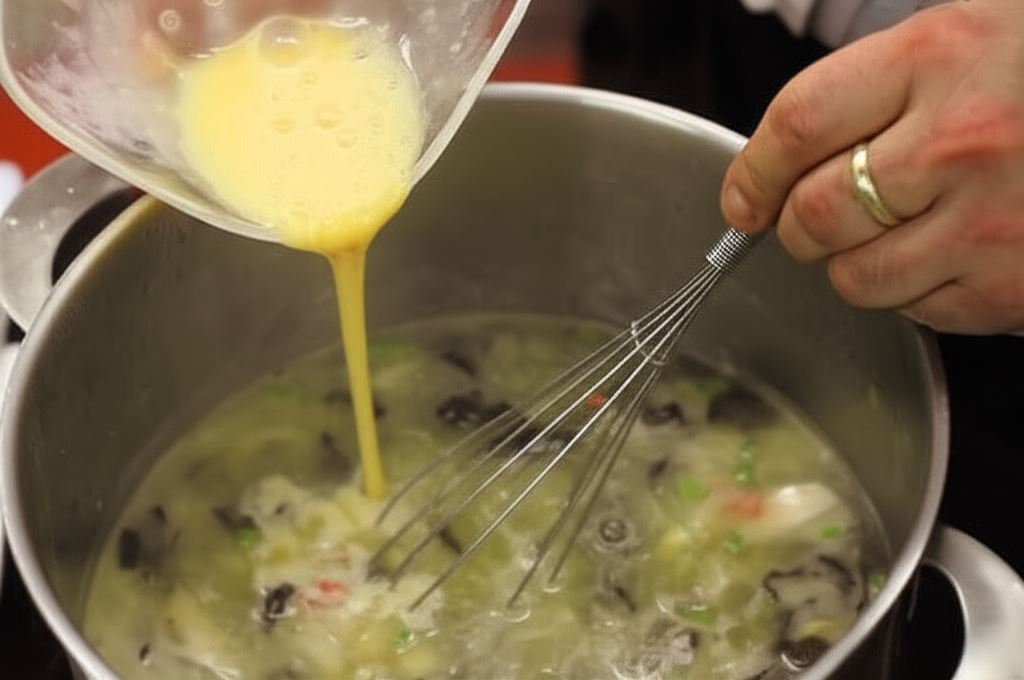 Jajko rozbij widelcem i także dodaj do zupy cały czas mieszając.