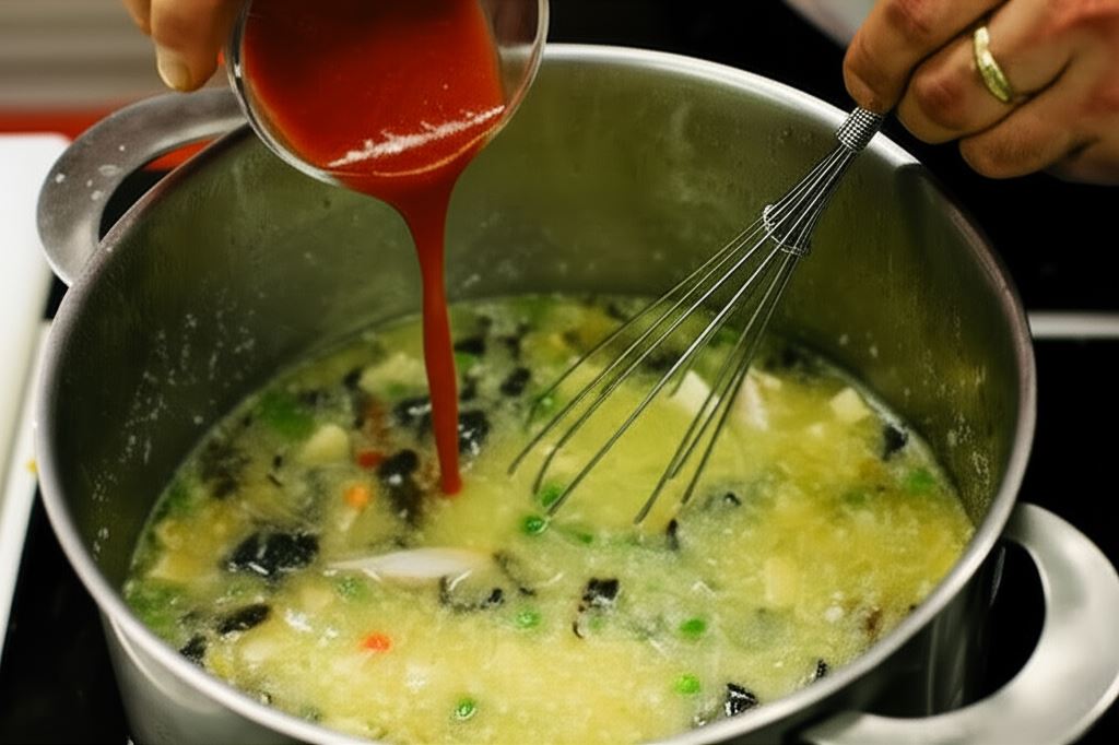 Potem wlej olej sezamowy, ocet i sok pomidorowy, po czym kontynuuj gotowanie.