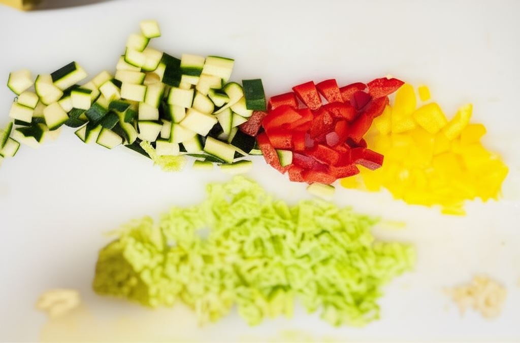 Wszystkie warzywa posiekaj w drobną kostkę. Czosnek pokrój.