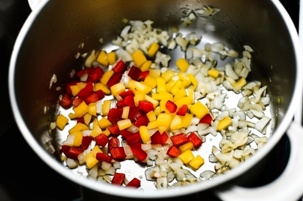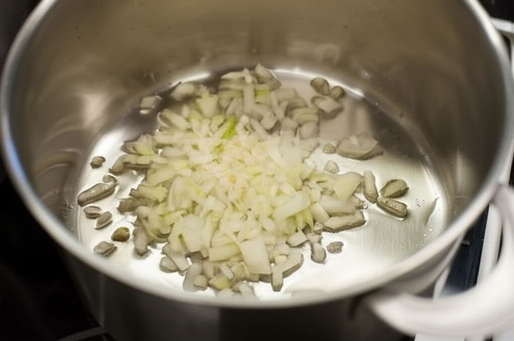 Na oliwie z oliwek podsmaż w garnku czosnek i cebulę.