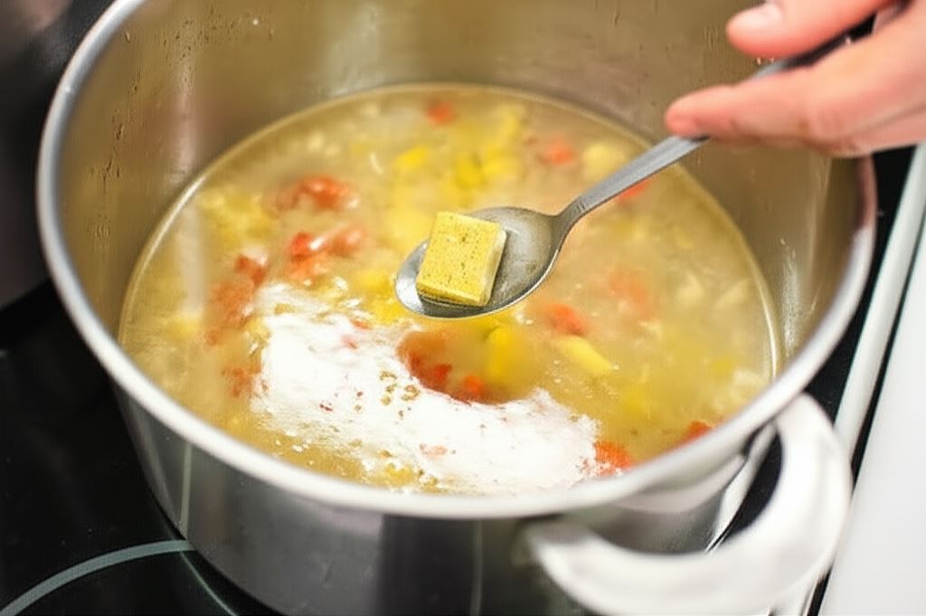 Następnie dolej do garnka 1,5 litra ciepłej wody. Wsyp kostki Knorr i oregano.