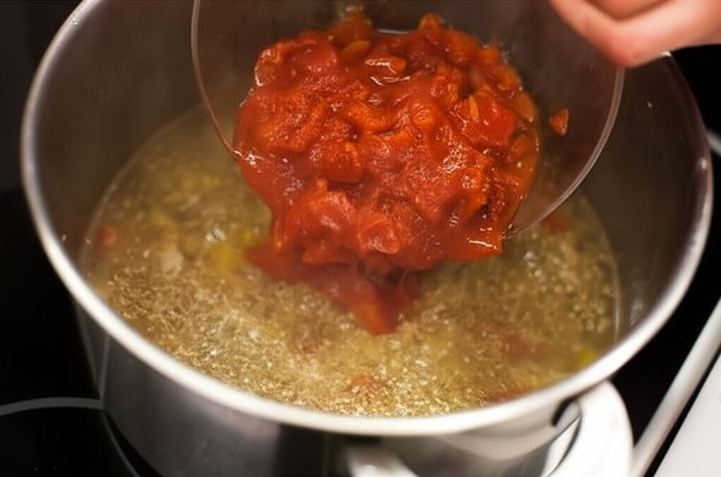Pomidory z konserwy posiekaj i także wrzuć do zupy. Wszystko zagotuj.