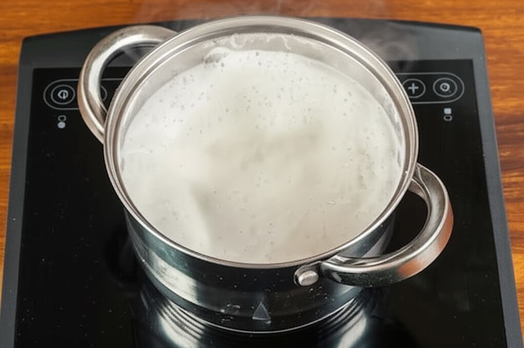 Potem odcedź, zalej zimną wodą i przełóż do wrzącego mleka. Wsyp cukier.