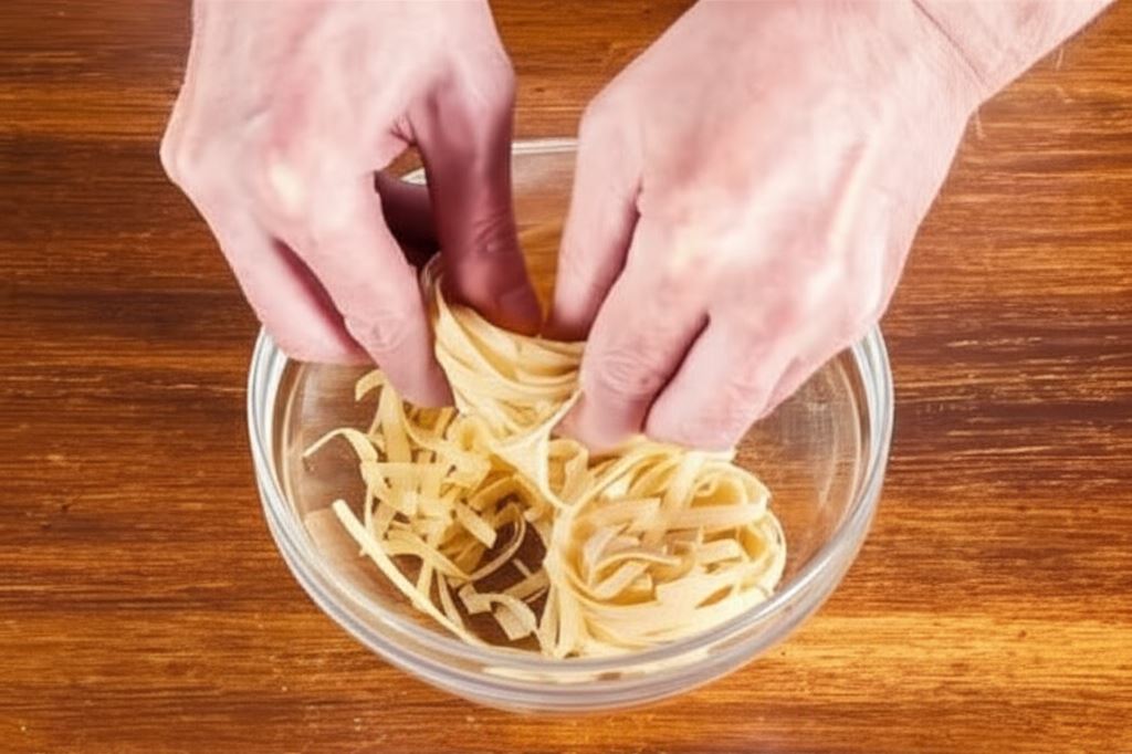 Makaron drobno pokrusz i wsyp do gotującej się wody.