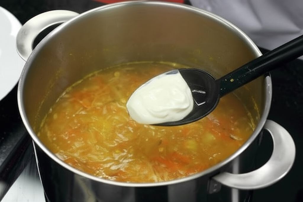 Potem rozmieszaj śmietanę w wodzie i wlej do gotowej zupy. Gotuj jeszcze przez 5 minut, a następnie serwuj z ziemniakami lub ryżem.