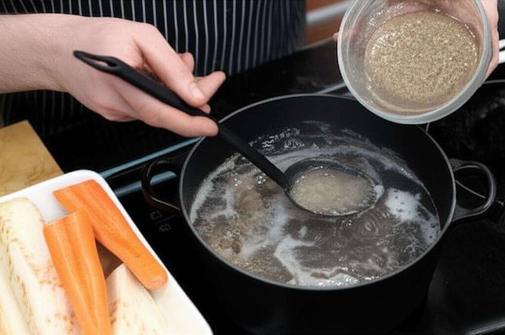 Kości oraz mięso wołowe zalej 8 litrami zimnej wody. Doprowadź do wrzenia, usuń utworzoną pianę. Wsyp warzywa i gotuj minimum 6 godzin na małym ogniu, aż wywar zmniejszy się o połowę.