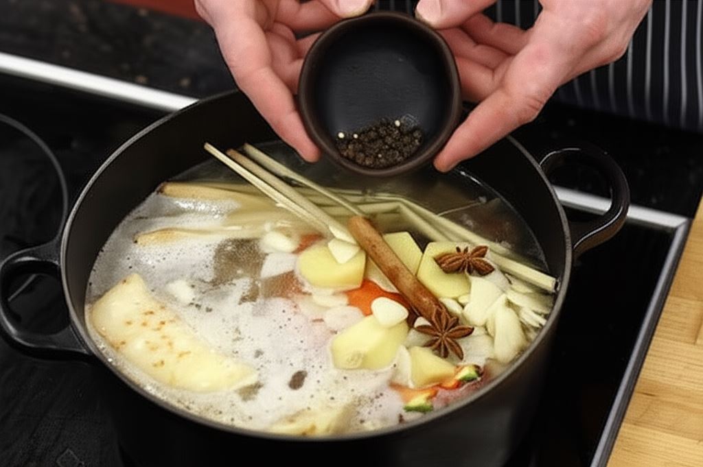 Wrzuć wówczas jedno przepołowione chili, laskę cynamonu, gwiazdki anyżu, trawę cytrynową, ziarna czarnego pieprzu, duży kawałek imbiru pokrojonego w plasterki, 5 ząbków czosnku, suszone krewetki. Wszystko gotuj jeszcze na małym ogniu przez około 1 godzinę.