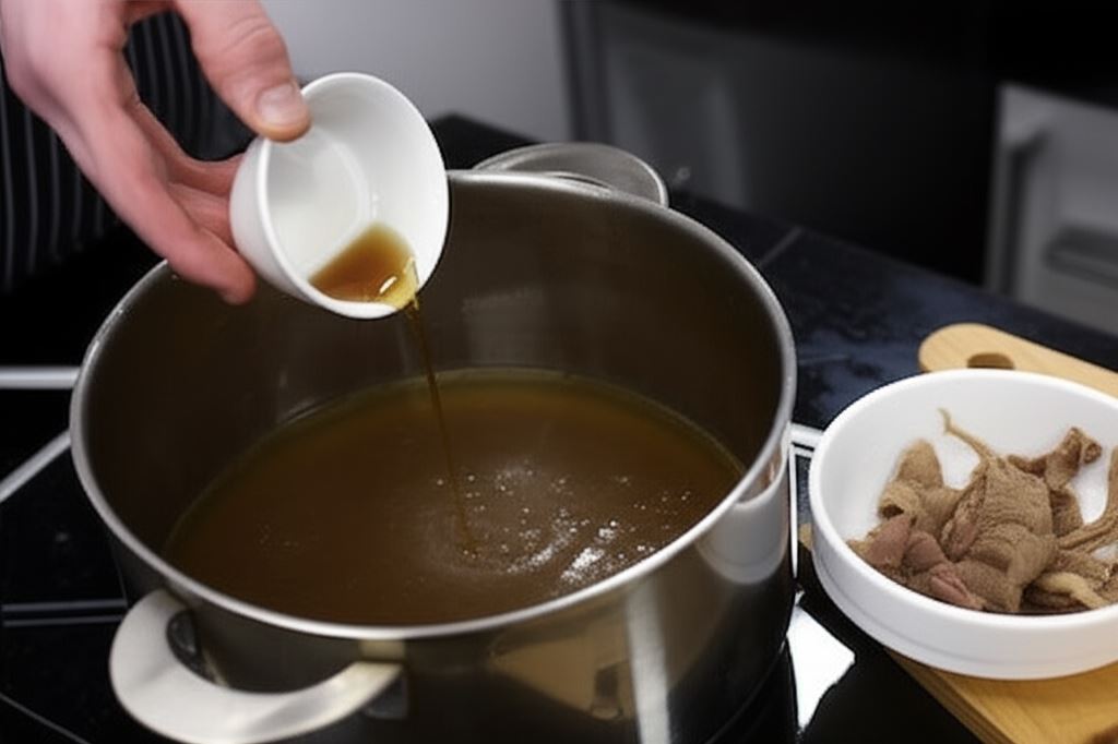Odcedź wywar, ale zachowaj mięso. Wywar dopraw do smaku sosem sojowym i sosem rybnym, w razie konieczności również niewielką ilością soli.